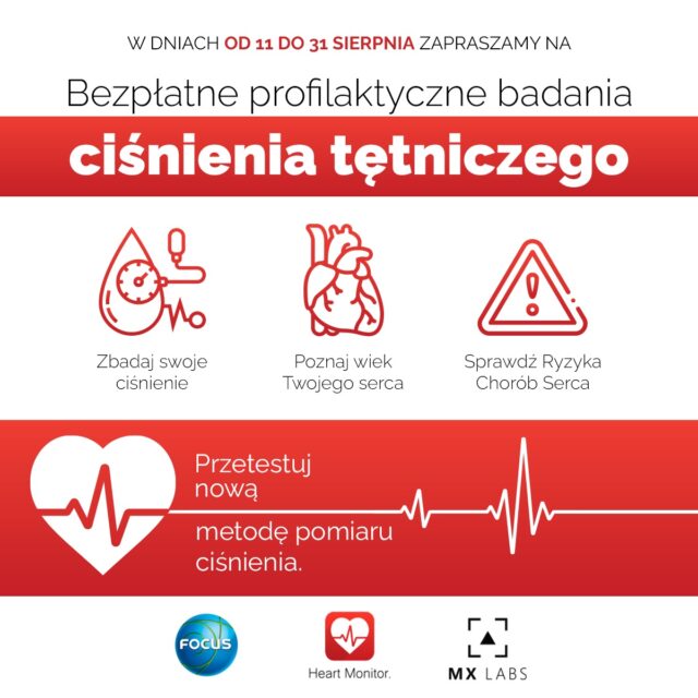 Przez cały tydzień klienci odwiedzający CH Focus mogą skorzystać bezpłatnie z profilaktycznego badania ciśnienia tętniczego. Warto kontrolować je systematycznie, ponieważ wysokie ciśnienie krwi jest głównym czynnikiem wystąpienia chorób serca. Dzięki innowacyjnej metodzie pacjenci na miejscu mogą sprawdzić wiek swojego serca oraz dowiedzieć się o ryzyku pojawienia się choroby wieńcowej. Badania przeprowadzają studenci 4. roku Wydziału Lekarskiego Collegium Medicum w Bydgoszczy, Uniwersytetu Mikołaja Kopernika w Toruniu pod kierunkiem zespołu badawczego Katedry Kardiochirurgii Collegium Medicum w Bydgoszczy, a także Kliniki Kardiochirurgii Szpitala Uniwersyteckiego Nr 1 im. dr A. Jurasza w Bydgoszczy. Stanowisko medyczne znajduje się na poziomie „O” galerii, tuż obok drogerii Hebe oraz tymczasowego punktu szczepień.
